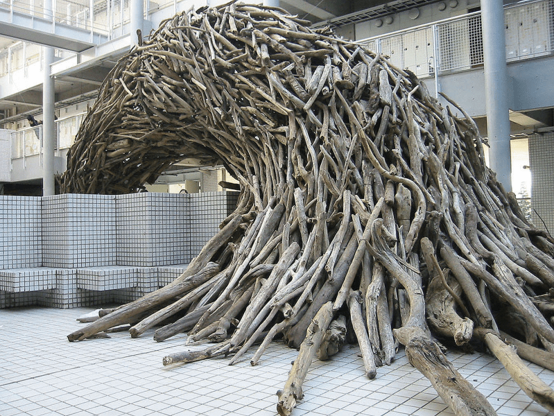私は現代において未だこのアニミズム的考えが日常の暮らしに浸透し、自然の生態系が見に見える場所があることに驚き、水と共に山から海へと流れていた流木を用い制作した。