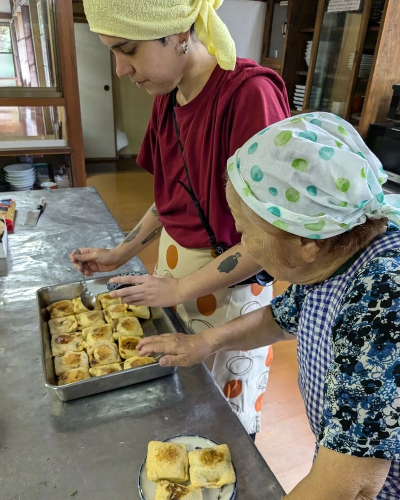 カミラさんが醤油を塗っているあげさんの中には、納豆とオクラが入っています。