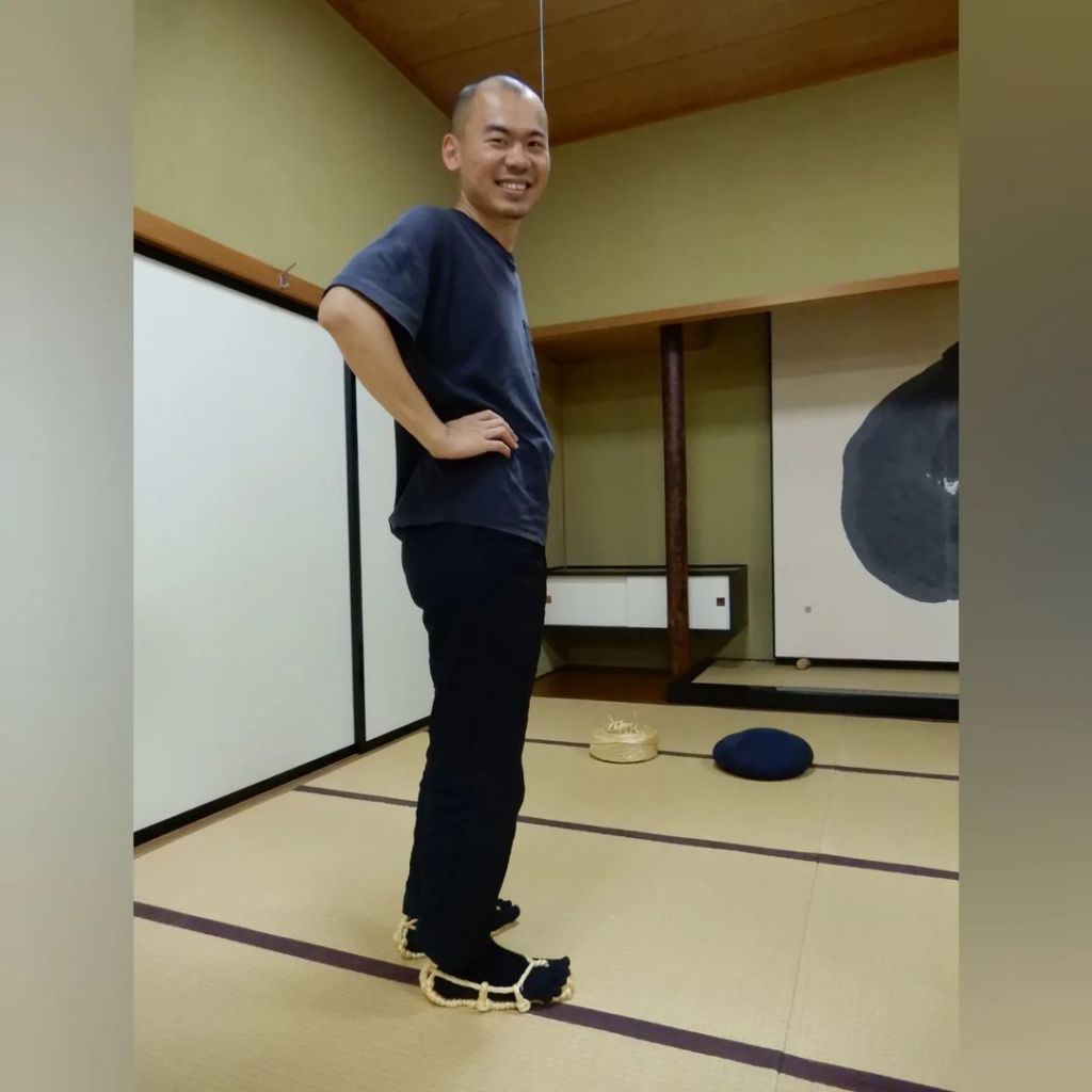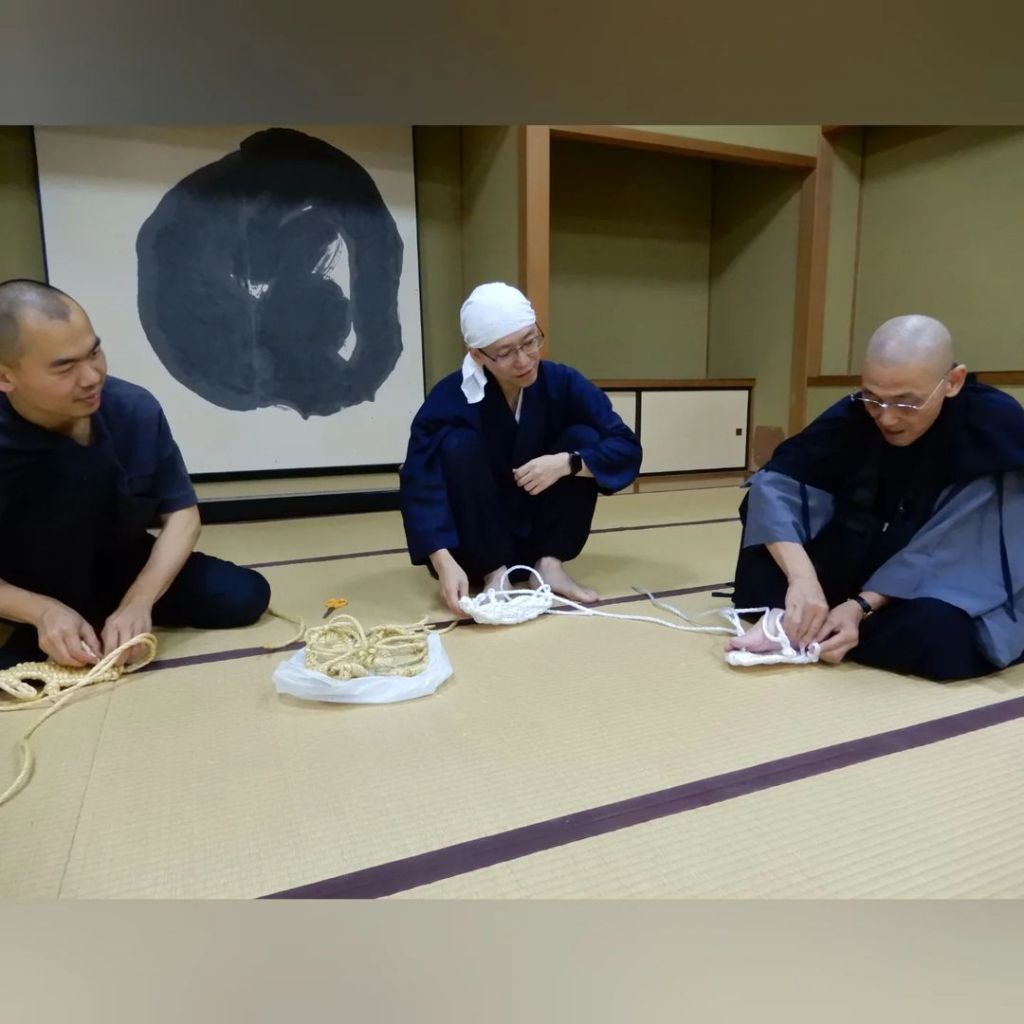 ミャオさん、大本山永平寺にて、わらじの作り方を教えていただきました。
